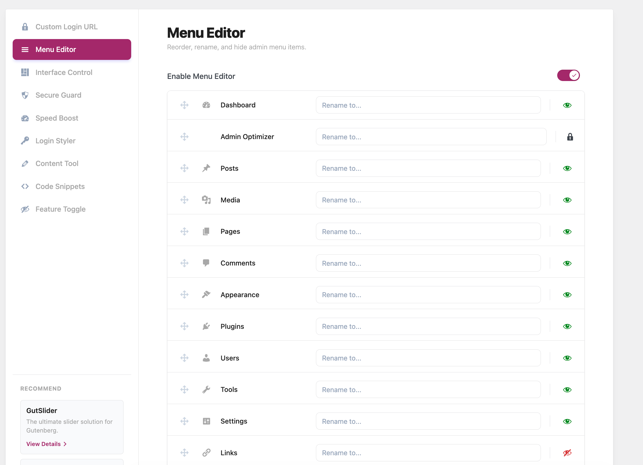 Sort, rename, and hide admin menu items to make it more user-friendly.