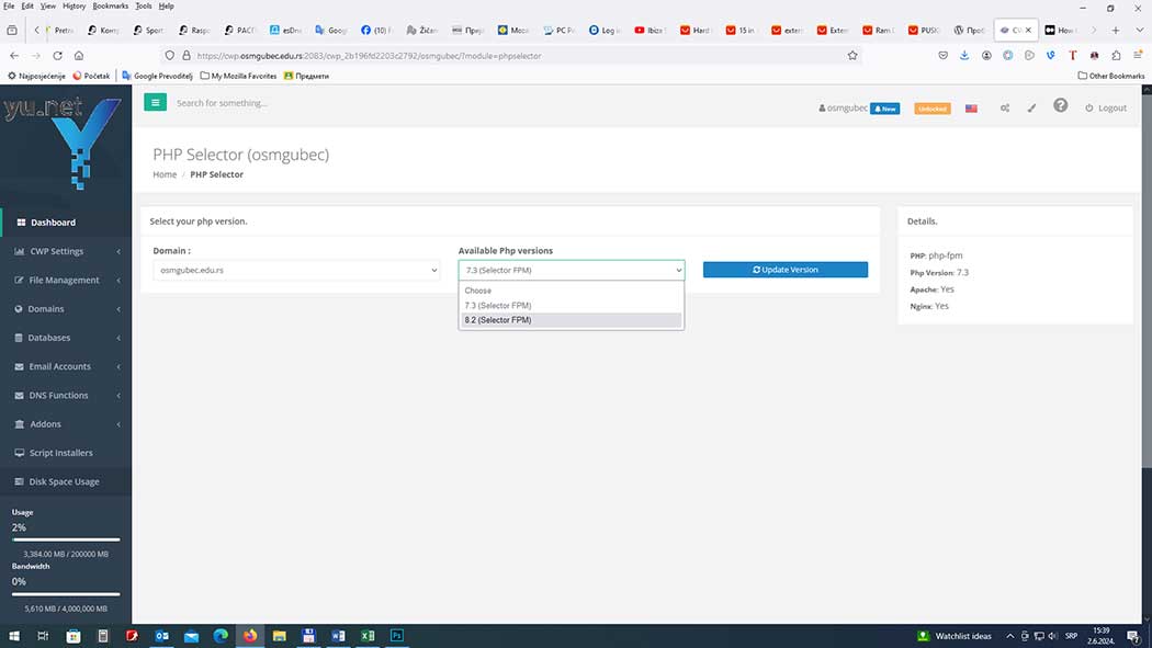 WordPress mi traži ažuriranje verzije php jezika. Provajder mi je savettovao da preko CWPanela i odeljka „PHP Selektor“ promenim trenutnu verziju PHP-a sa 7.3.3 na 8.2 (koju je moguće odabrati za ovaj domen). Kada to uradim nije više moguće otvoriti sajt – ni kao korisnik, ni kao administrator.